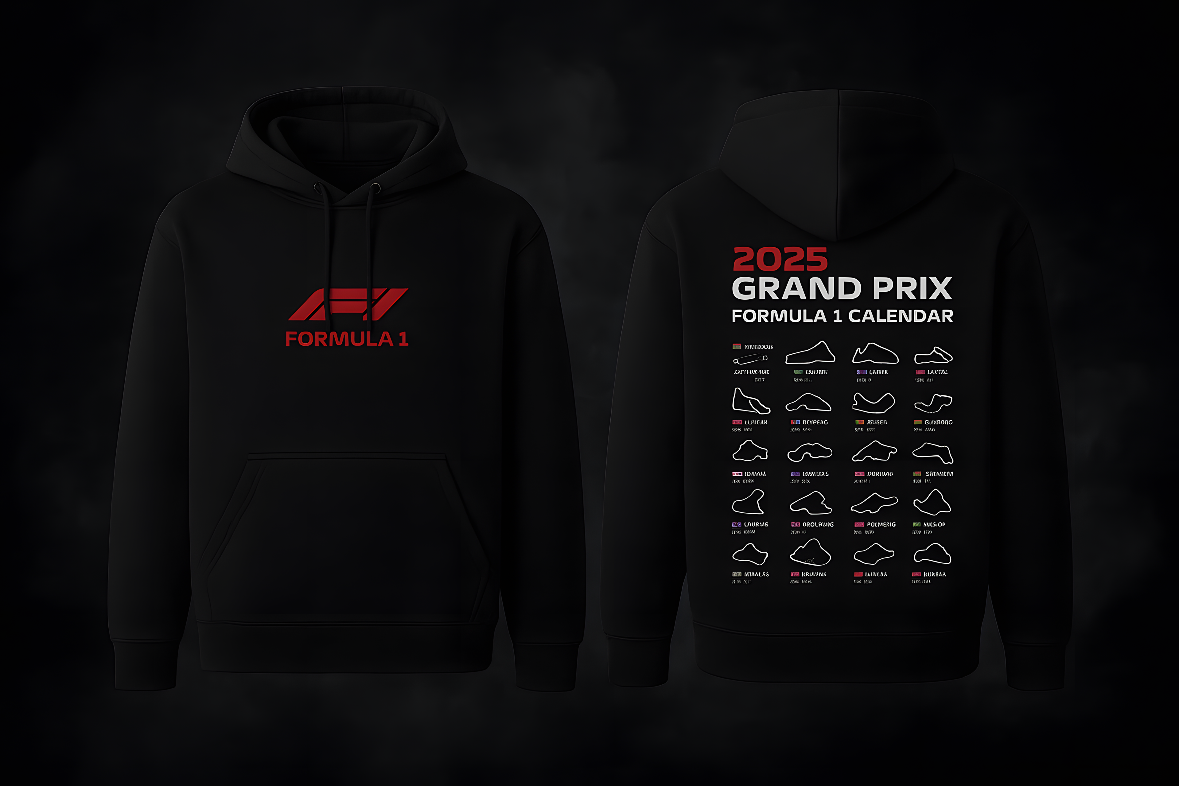 Celebrate the thrill of Formula 1 with the Torque Threads 2025 Grand Prix Collector Hoodie — a limited edition piece designed for true motorsport fans. Featuring the entire 2025 Formula 1 race calendar printed on the back with bold red accents, this hoodie is both a style statement and a collector’s item